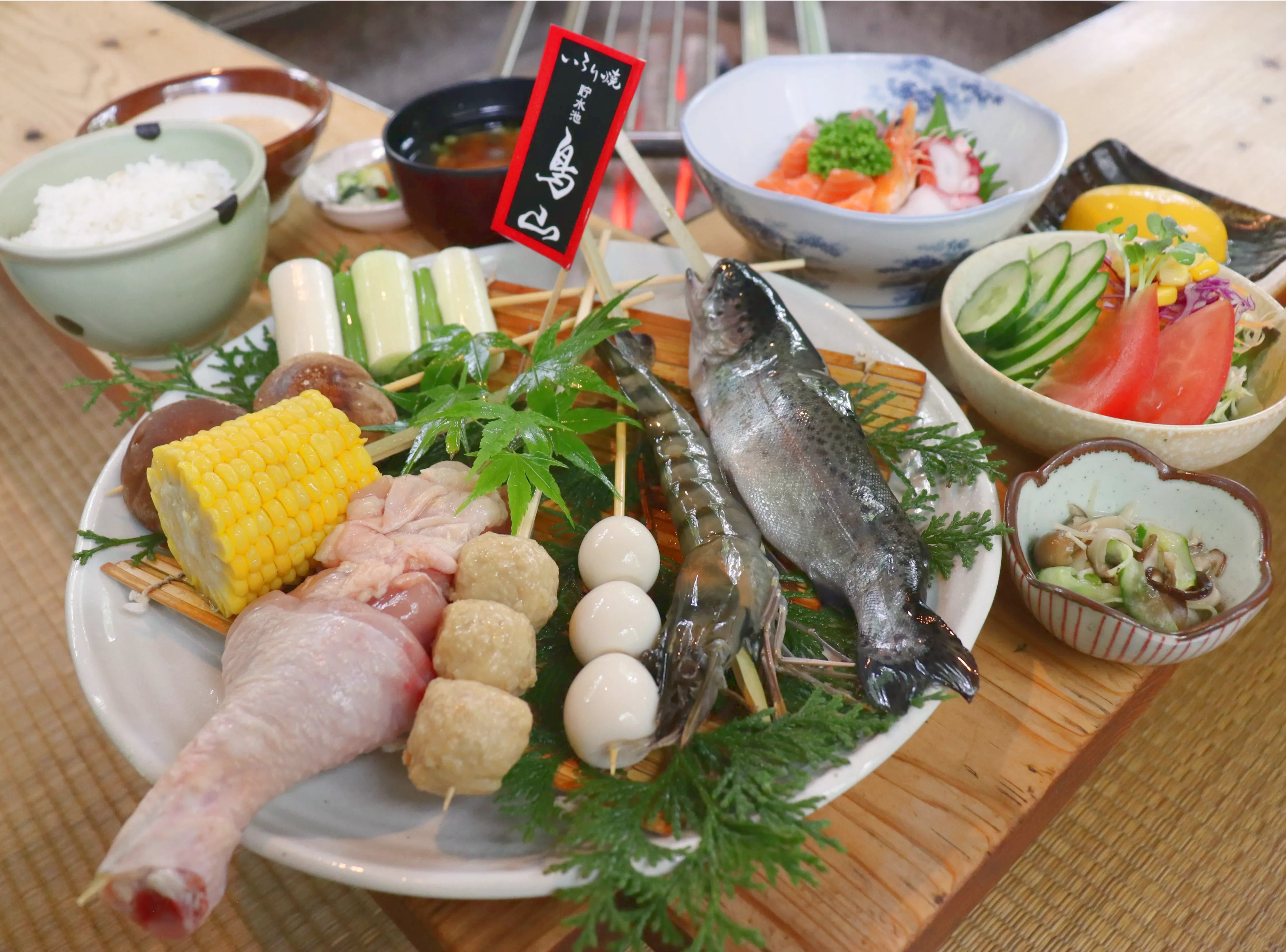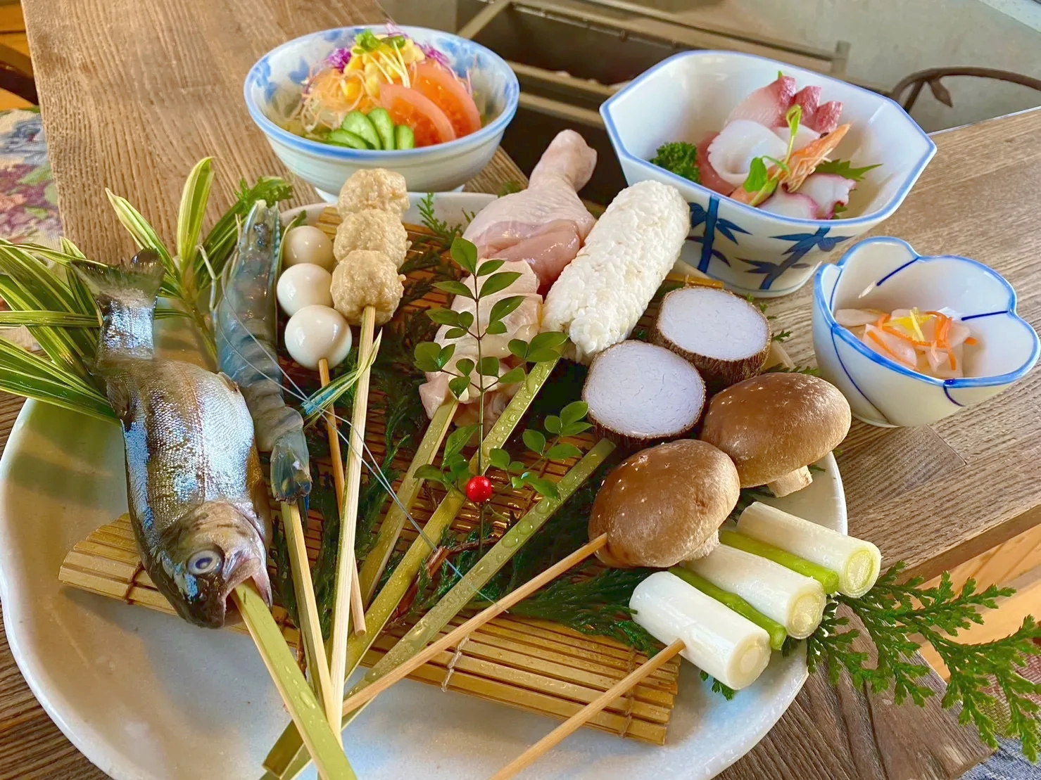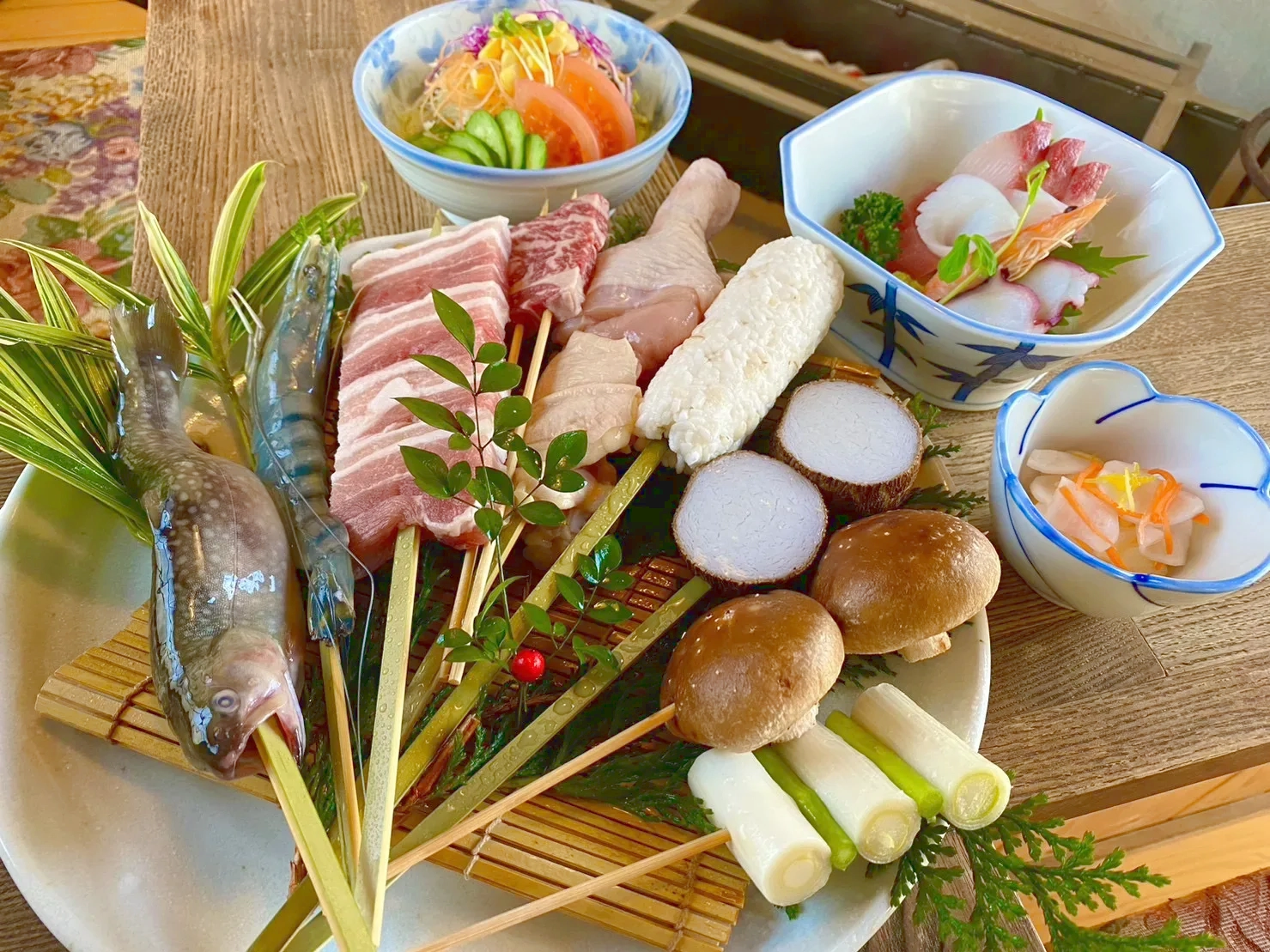 長崎和牛・霧島豚バラ・骨付き大山鶏・岩魚・海老・きりたんぽ・野菜 里芋(季節により地物トウモロコシ)