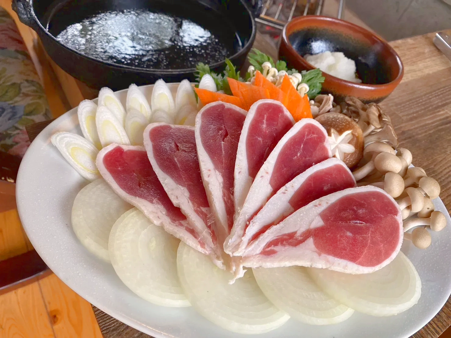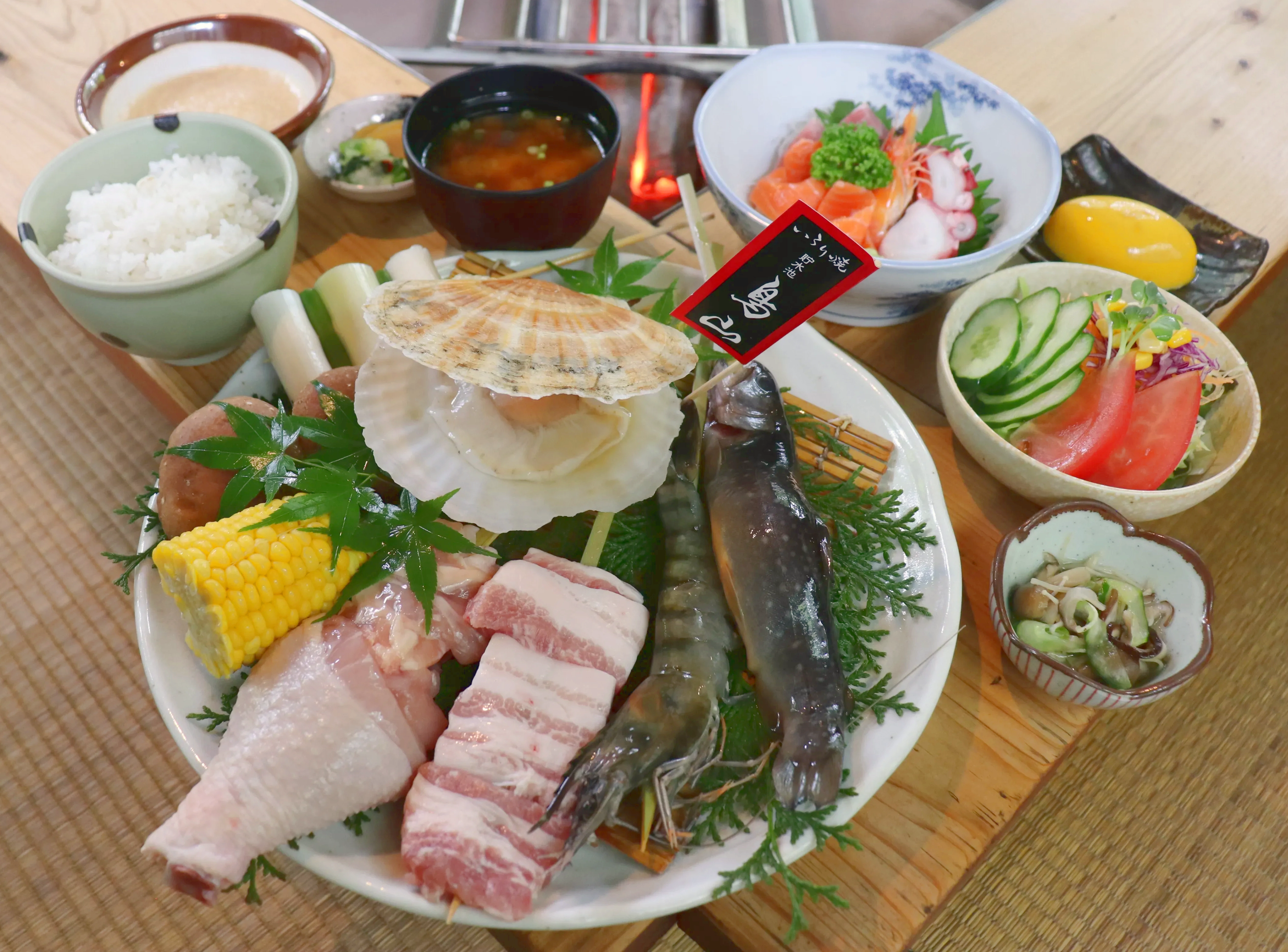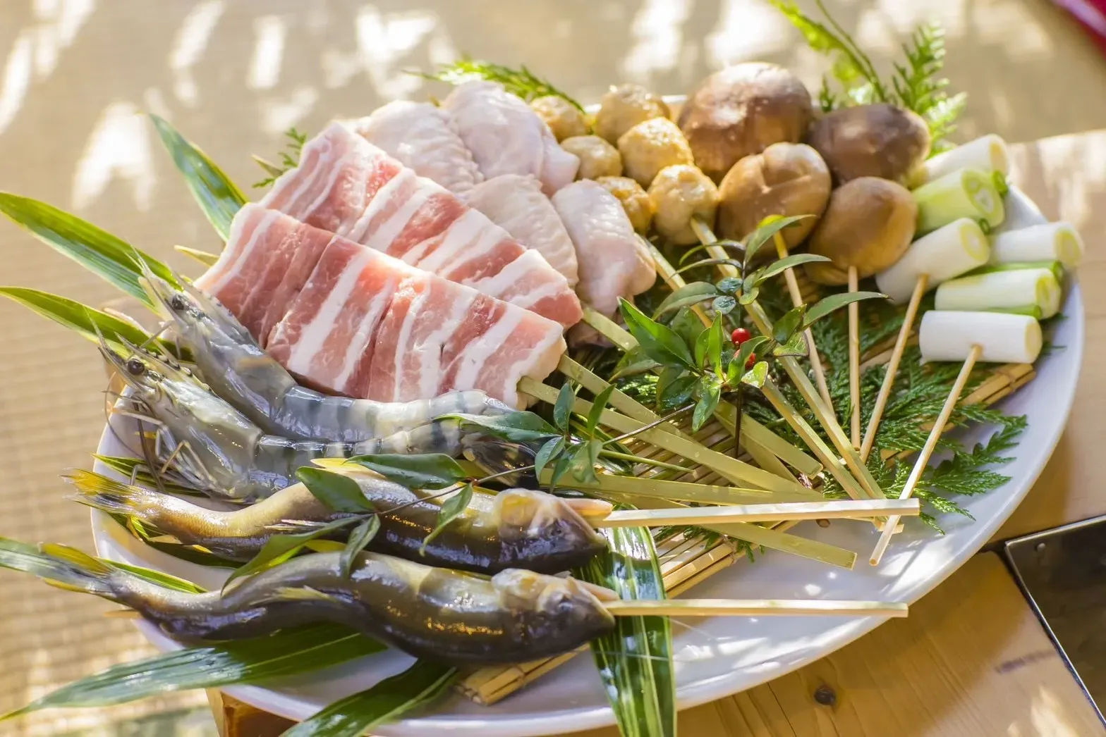 長崎和牛・霧島豚バラ・骨付き大山鶏・岩魚・海老・きりたんぽ・野菜 里芋(季節により地物トウモロコシ)
