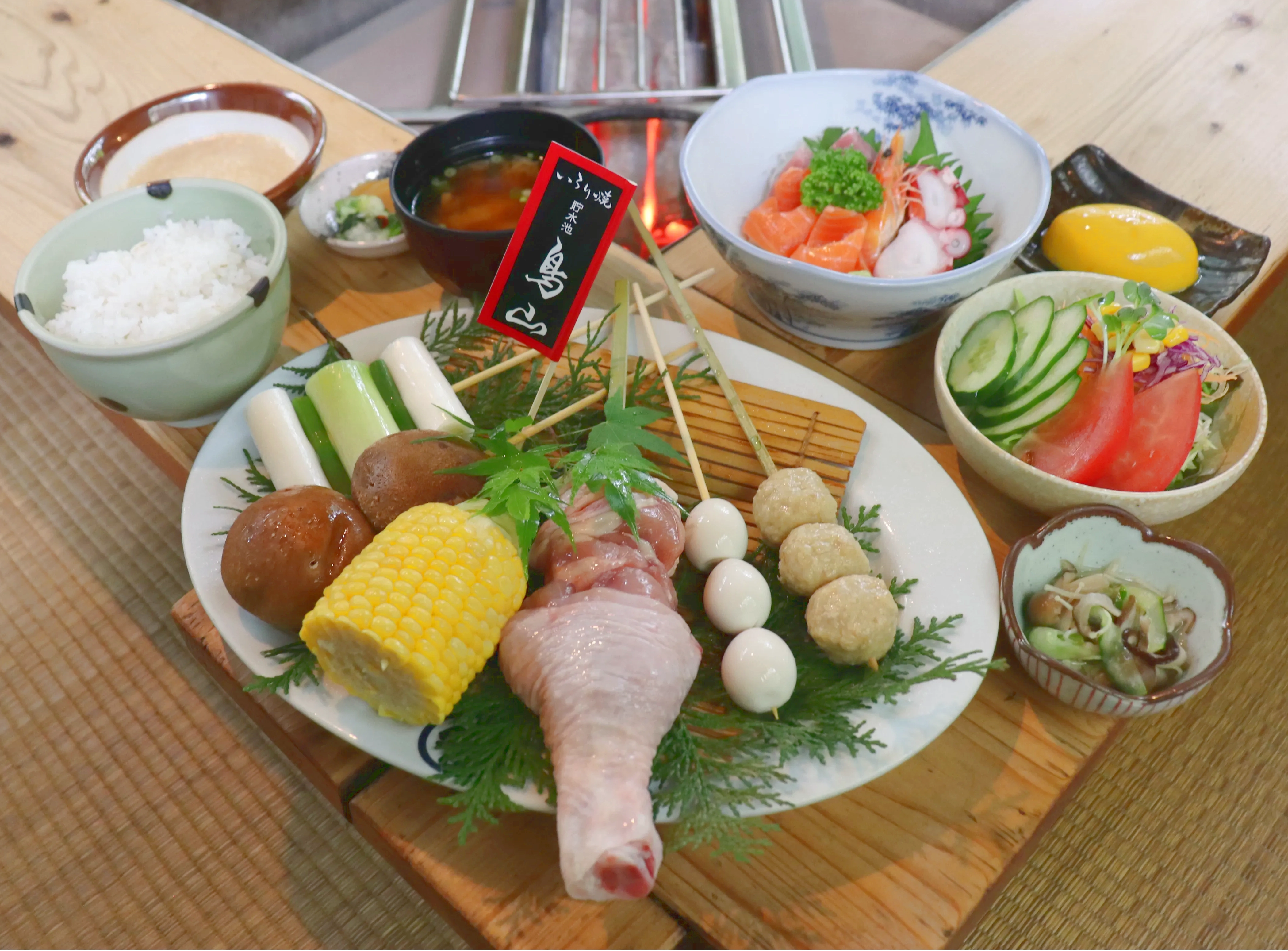 骨付き大山鶏・つくね・たまご・きりたんぽ・野菜・里芋(季節により地物トウモロコシ)