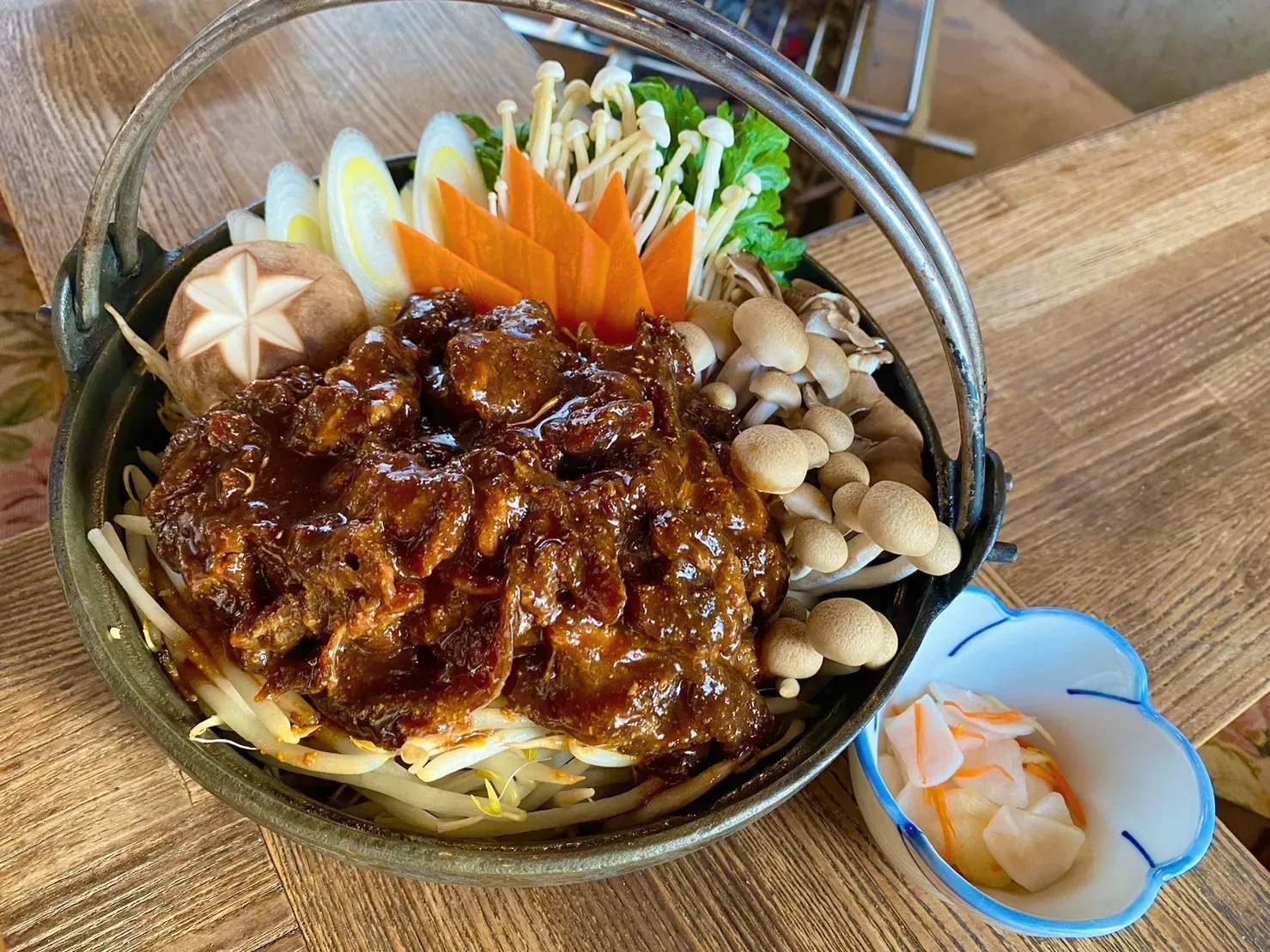 特製にんにく味噌だれ仕込みの牛肉とラム肉。肉汁の深みを余すことなく受け止めた旬のたっぷり鍋野菜を味わう、スタミナ溢れる逸品。
