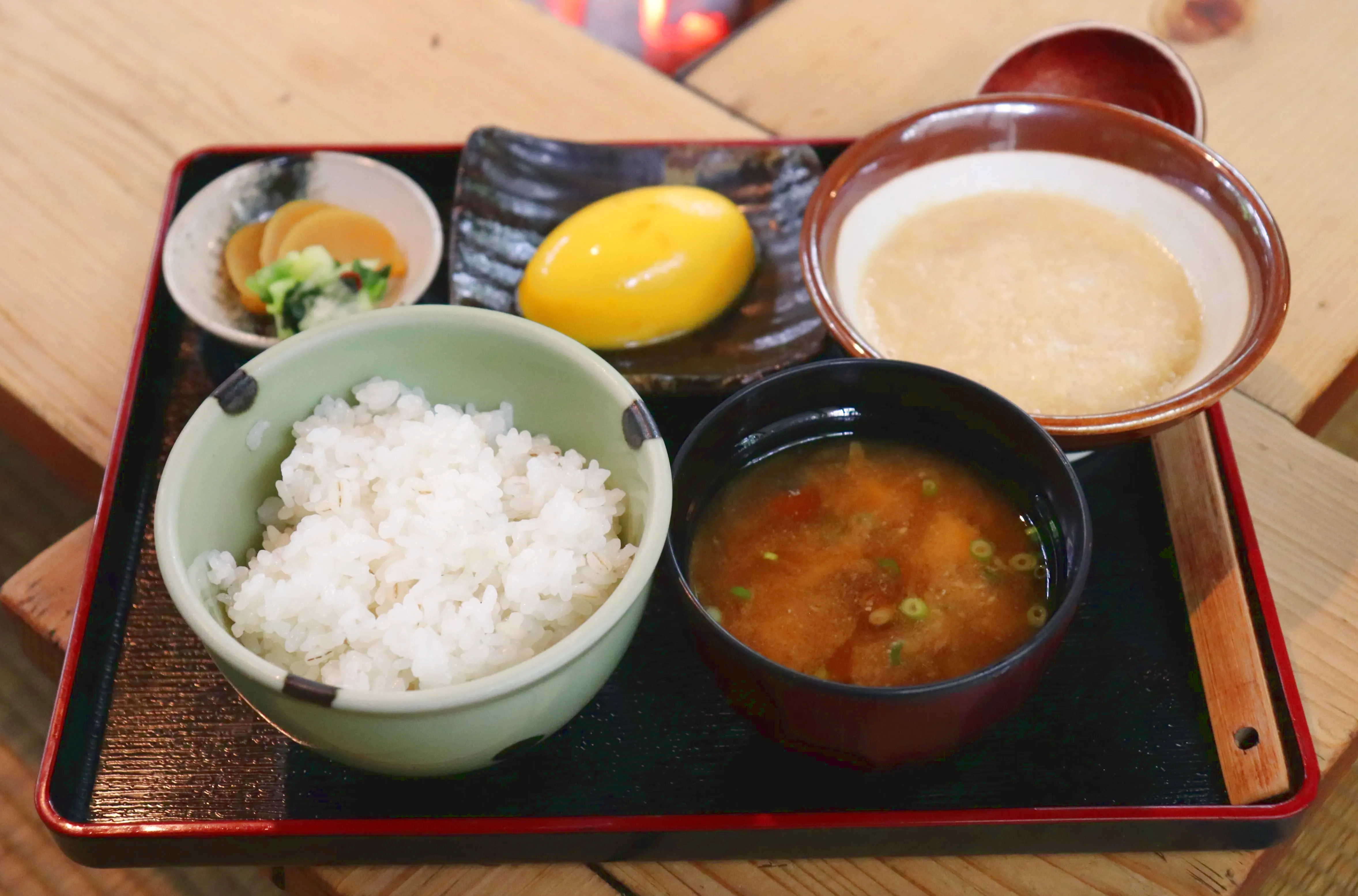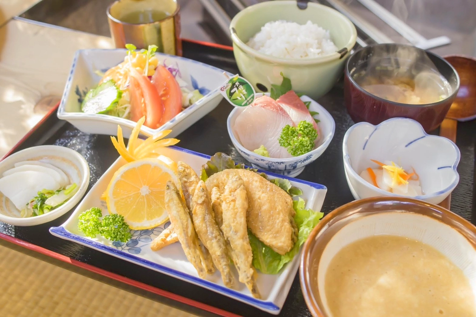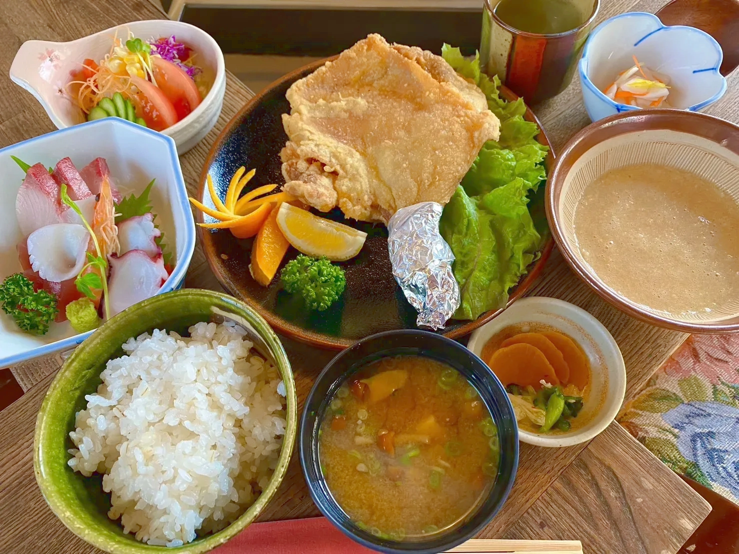 自家製100%鶏油で揚げた地養鶏もも唐揚げ(国産小麦粉使用)お刺身・サラダ・麦ご飯・とろろ・なめこ汁お通し・香の物・お口直し(麦ご飯は佐渡ヶ島産コシヒカリを秩父から汲んできた天然水で炊いています。なめこ汁のお出汁も天然水仕立てです。)