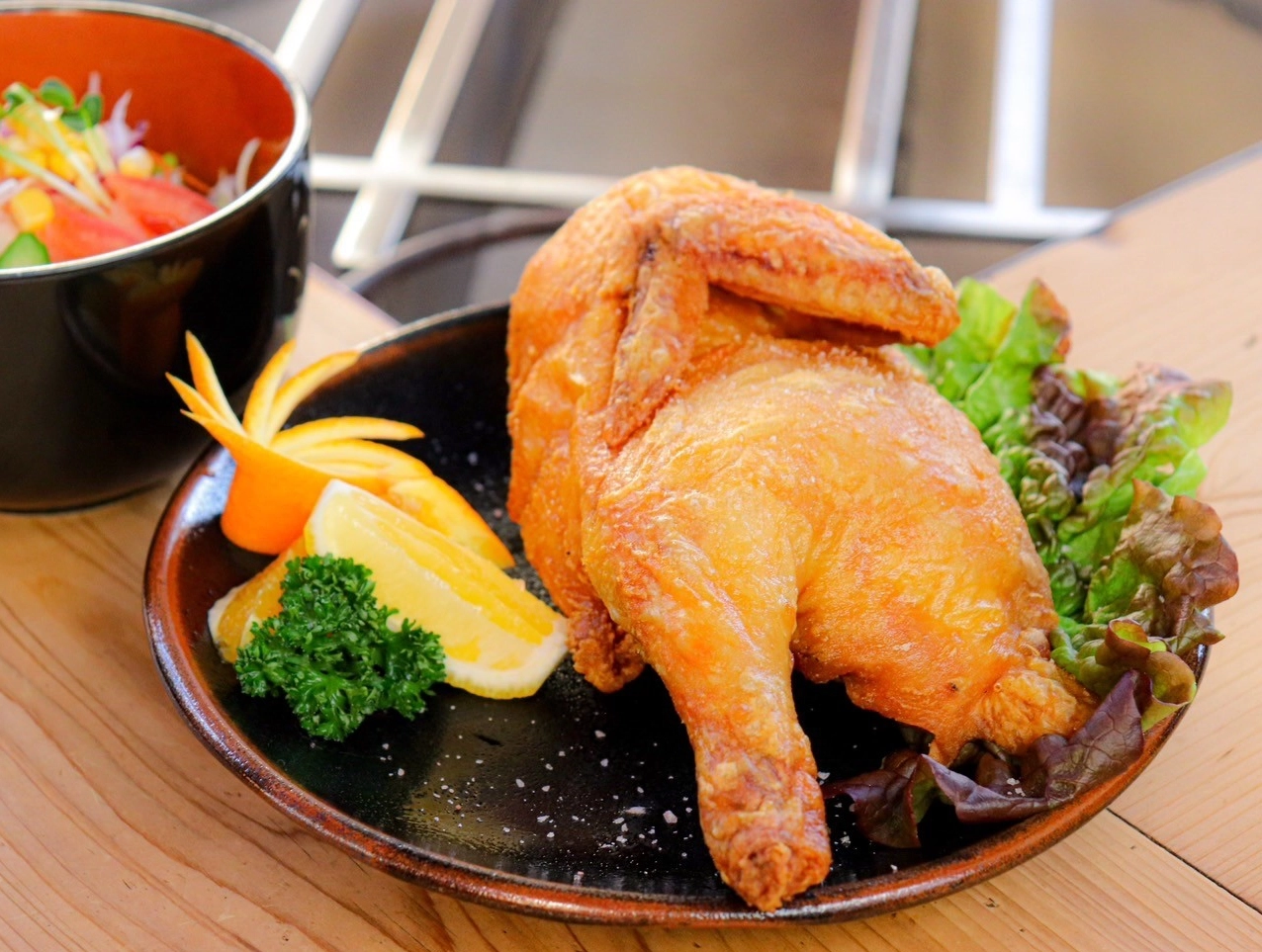 自家精製した100%鶏油で揚げた国産鶏半身の丸揚げ(国産小麦粉使用)