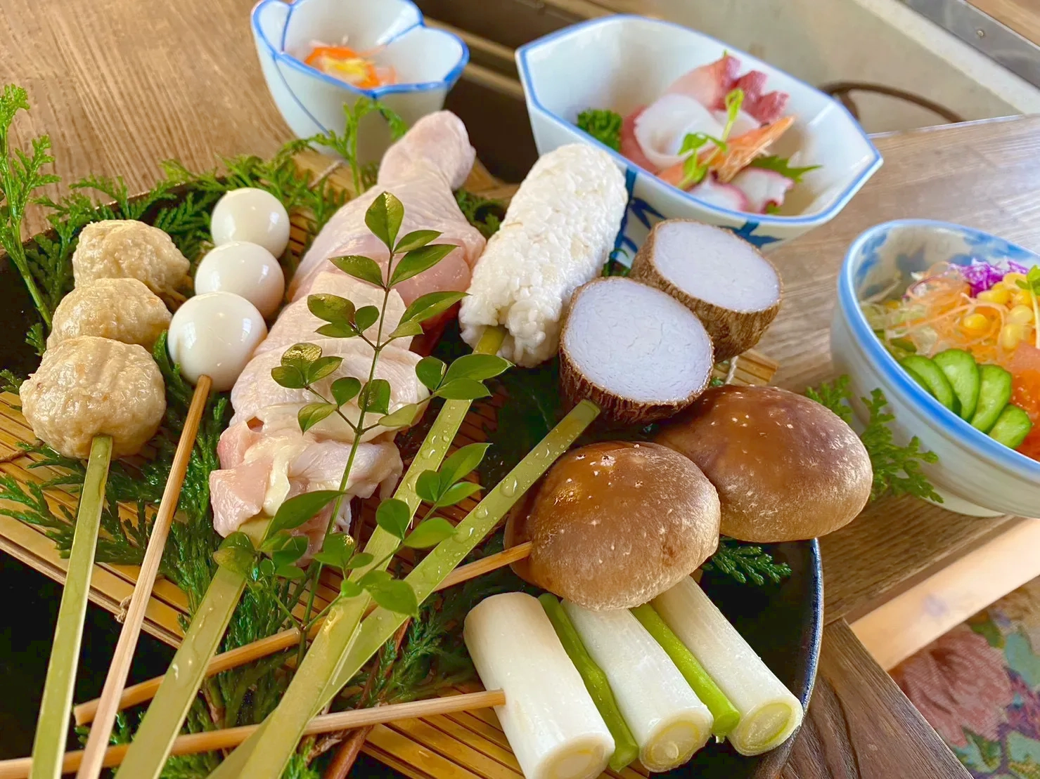 骨付き大山鶏・虹ます・海老・つくね・たまご・きりたんぽ・野菜・里芋(季節により地物トウモロコシ)